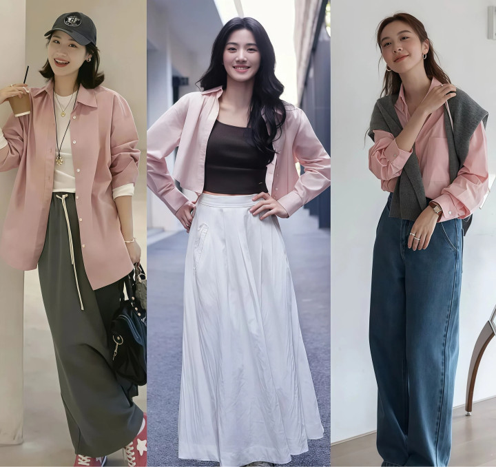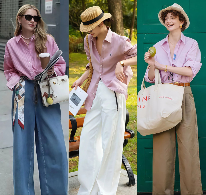 搭配①粉色衬衫+宽松下装,比如半身裙/阔腿裤