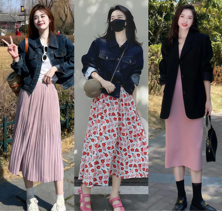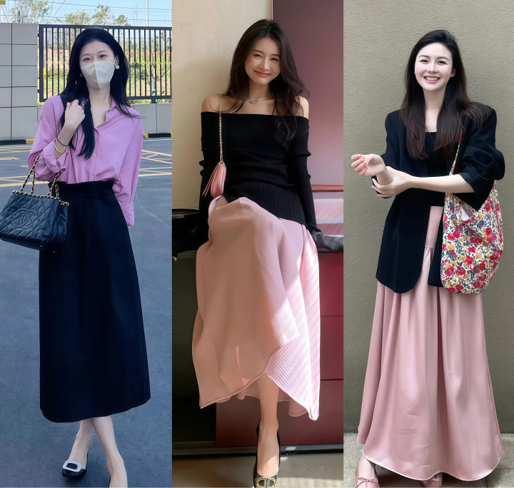 偏好干练作风的话,不错把百褶裙换成粉色直筒裙,搭配玄色西装外衣或者牛仔外衣,裙长到膝盖下方八到十厘米这个位置,显瘦遮肉还有气质,通勤出街穿这一套皆很合适。