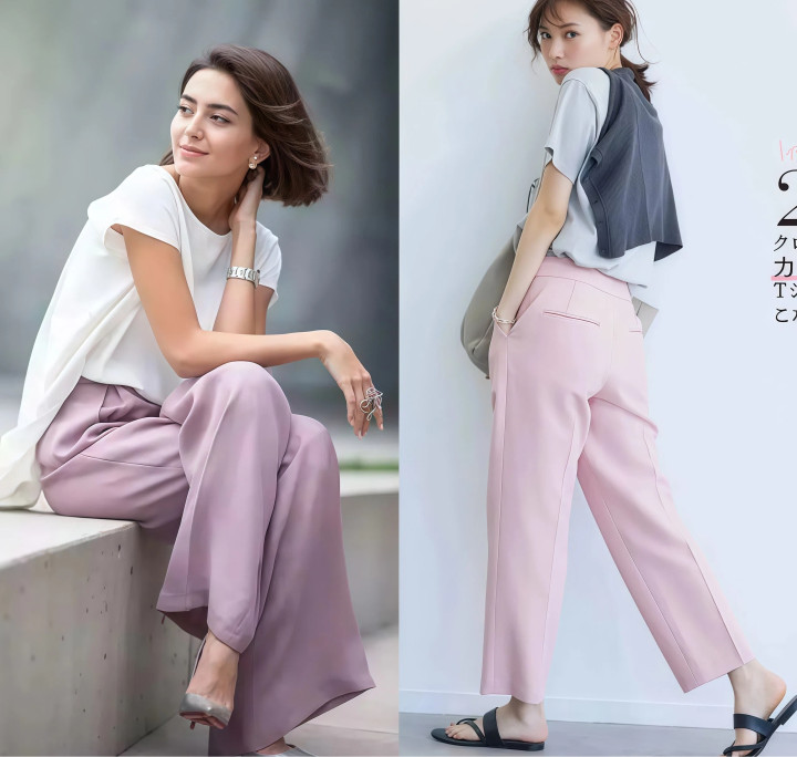 选直筒裤的时辰,别选裤腿太窄的样式,粉色上衣配贴腿的窄裤,容易让举座比例失衡,裤腿满盈量的直筒裤更互助,裤脚宽度好像22到24厘米穿戴最利落。