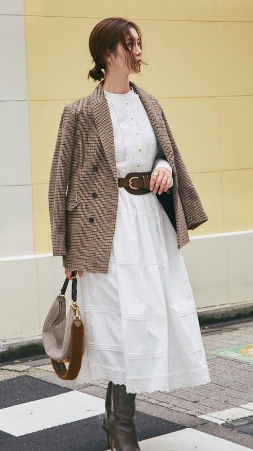 自带相沿气味的格子西装,久穿不腻,况兼每年春天拿出来穿,不错搭配多样流行的单品。在本年春天,就特地合适配小白裙,节略传递出优雅马虎的气质,“内长外短”的搭配,还能拉长体态线条。