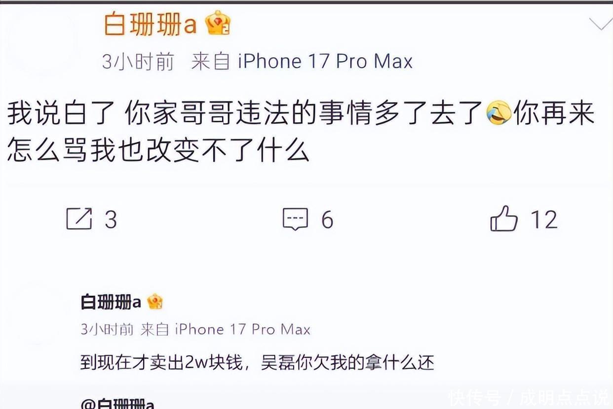 刚开年,内娱就演出了一出乖谬剧——有东谈主靠编故事收钱,尽然真有大把东谈主入彀。1月18日,一个叫白珊珊的博主顿然在应付平台点名吴磊,说手上有“床照”,还甩出一句“你欠我的拿什么还”,一会儿引爆热搜。可细看才发现,这哪是爆料,分明是哄骗:先收2万才肯显现名字,再拉群收1万“看实锤”,后果钱一凯旋,东谈主就隐匿得九霄。 更离谱的是,她宣称2025年11月20日在澳门见过吴磊,可东谈主家本日明明在浙江建德拍《剑来》,行程、IP全对得上,根蒂没空飞澳门。粉丝凯旋甩出剧组秘书单,空话不攻自破。