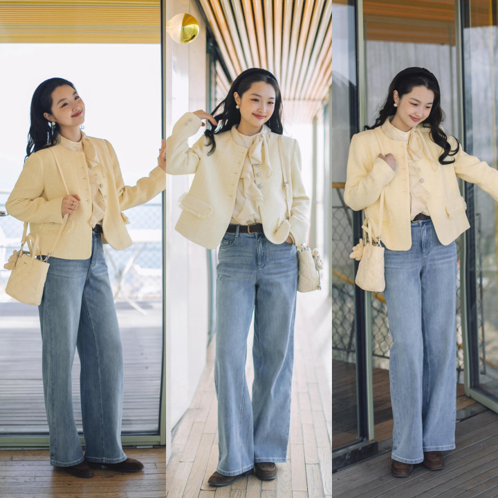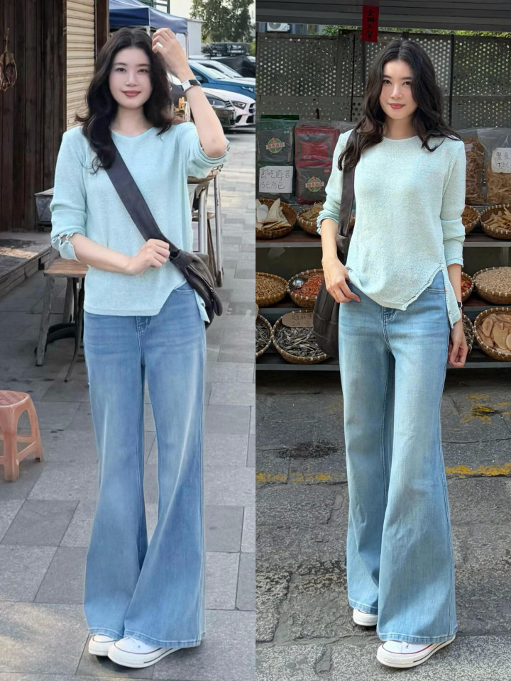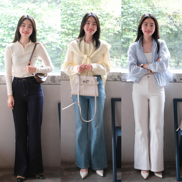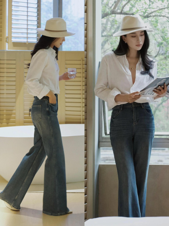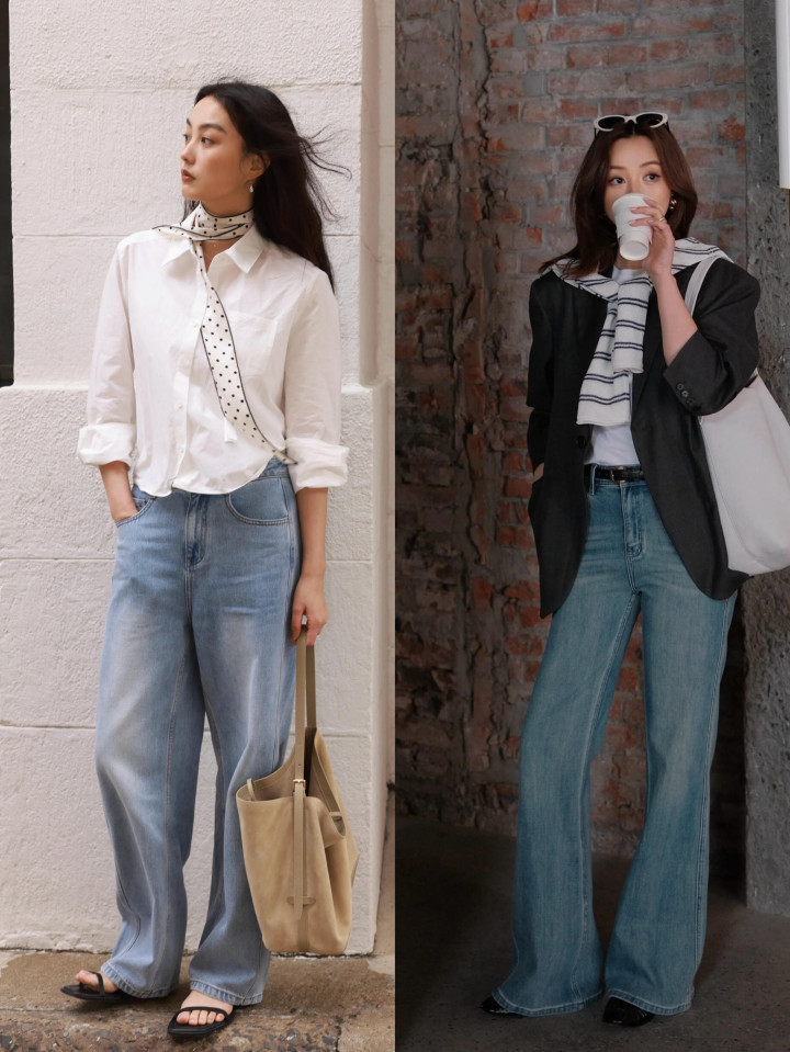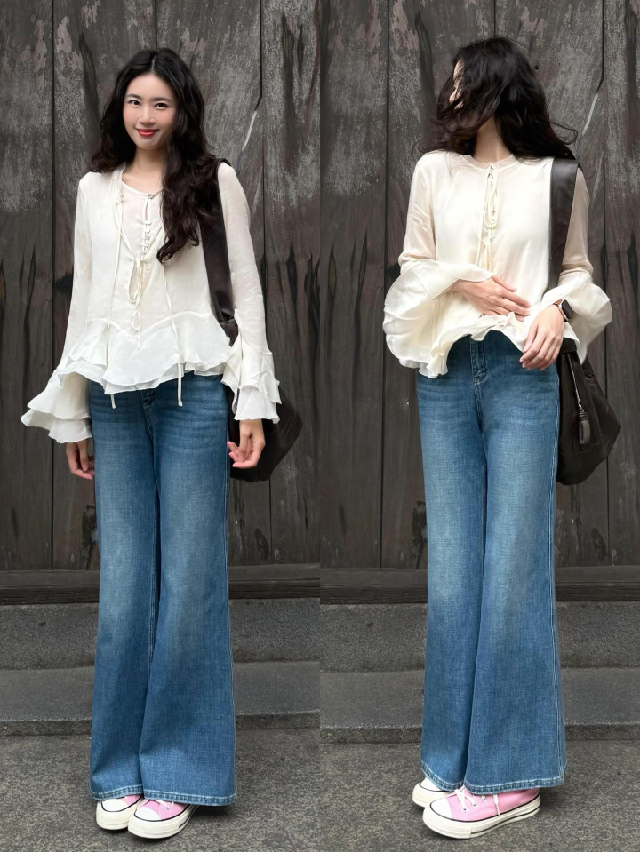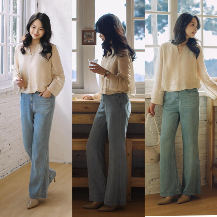 Tips②:杏色衬衫+蓝色微喇叭牛仔裤