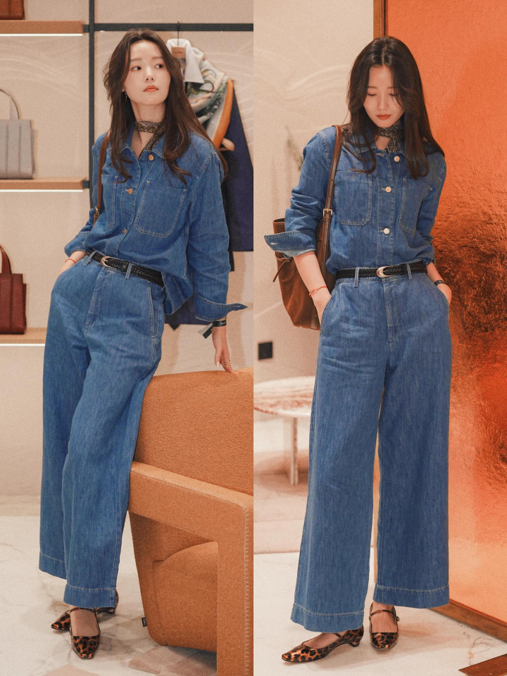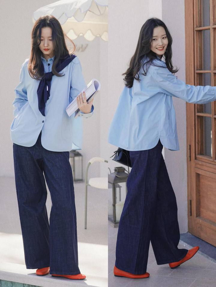 Tips③:雾霾蓝衬衫+蓝色牛仔直筒阔腿裤