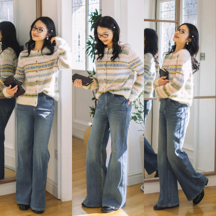 Tips③:镂空筹算开衫+牛仔直筒裤