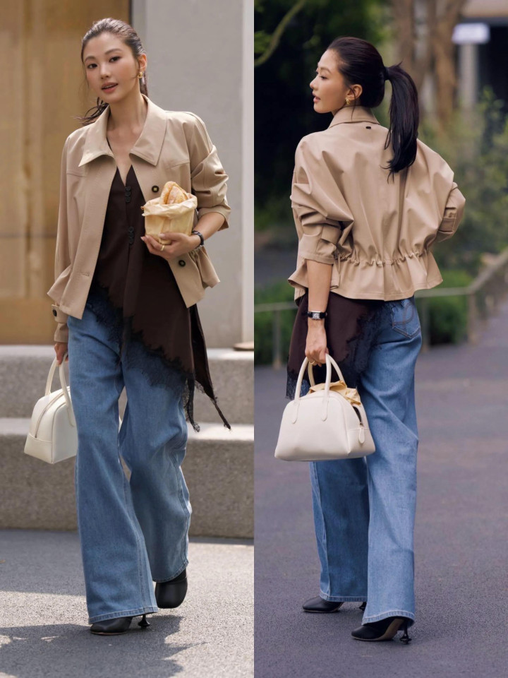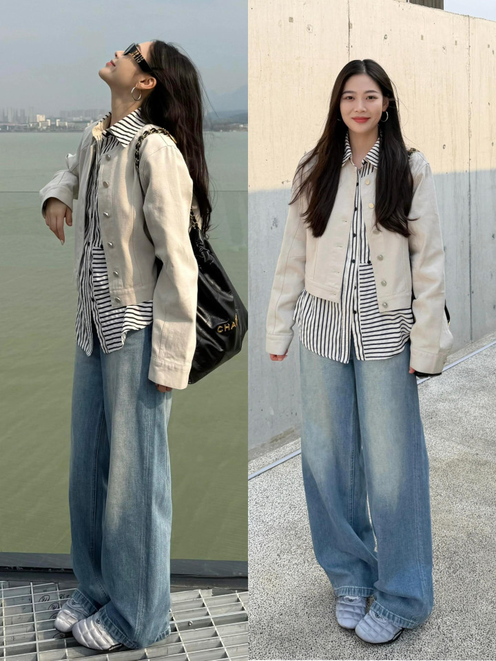 上头的这孑然穿衣造型还蛮相配的,用浅卡其色的短夹克外衣内搭条纹衬衫,配上高腰收腰的牛仔阔腿裤,穿搭的时辰并莫得把内搭的衣角塞进裤子内部,这种穿衣打扮慵懒即兴,呈现出一种率性感。