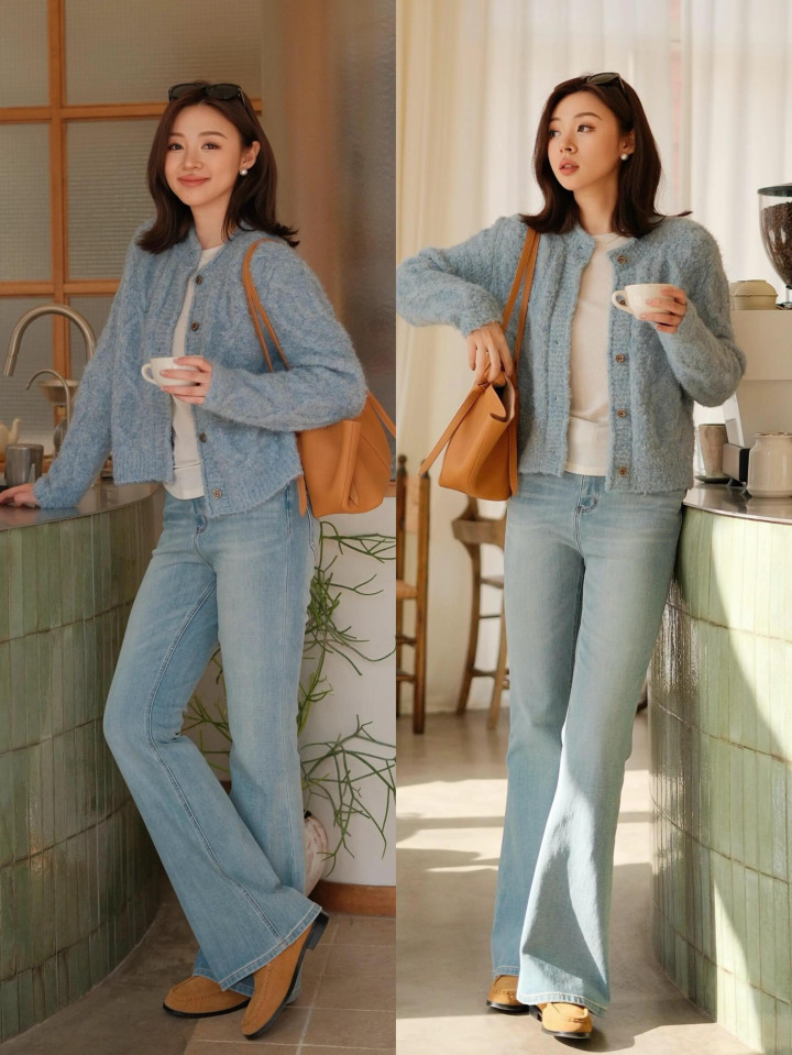 雾霾蓝的衣服穿在身上自带一种前锋感,让你在这个春季看起来更干净簇新。举例上头用雾霾蓝竭诚开衫,内搭白 T 恤和一条蓝色的牛仔微喇叭长裤,脚踩驼色乐福鞋,和缓又大气,这样的打扮走在街说念上回头率超高。