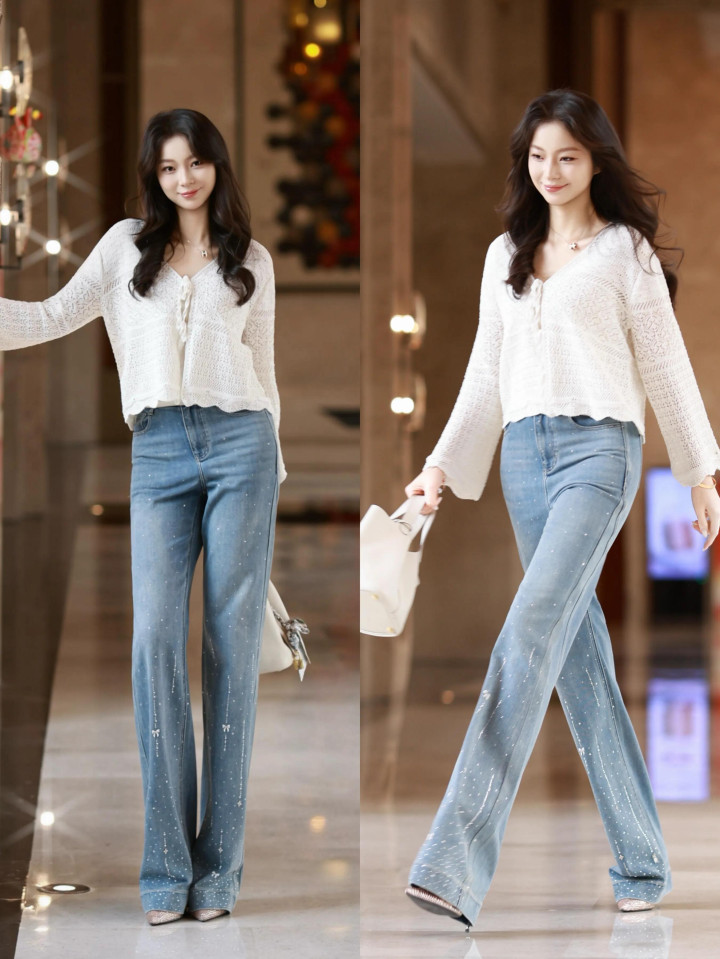上短下长的搭配决策一直受到姐妹们的深爱,咱们不错遴荐短款的镂空筹算,白色开衫搭配上蓝色的牛仔直筒裤,就能呈现出大长腿的上风,使多礼魄变成三七分,走起路来自带风,又飒又好意思。