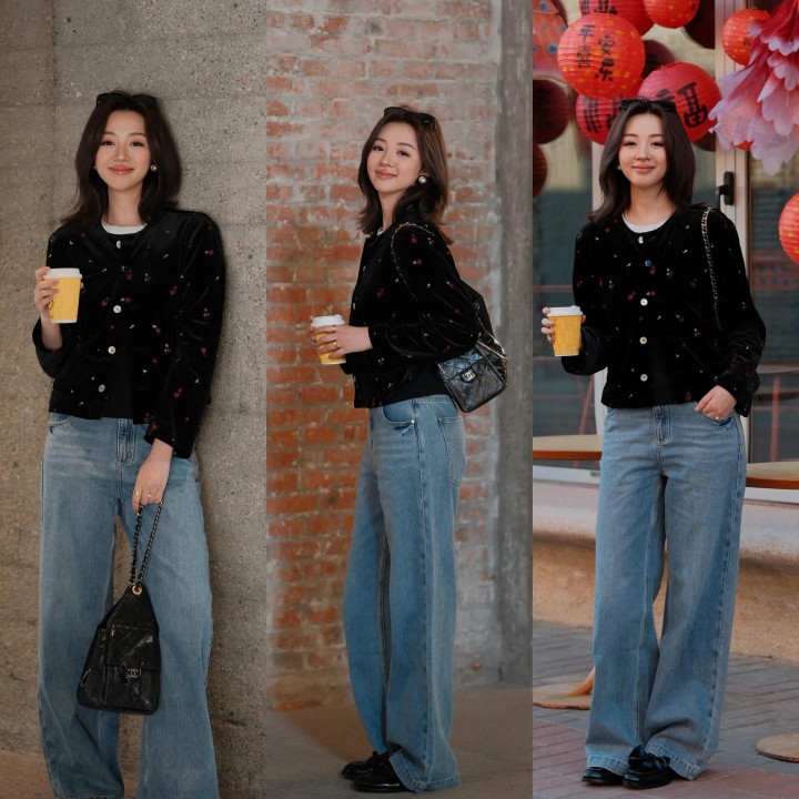 牛仔裤的神气大同小异,念念要转变立场,其实要点仍是在上衣,咱们不错遴荐一件短款的印花刺绣玄色竭诚开衫,内搭白 T 恤,千里稳又大方,和缓娴雅。