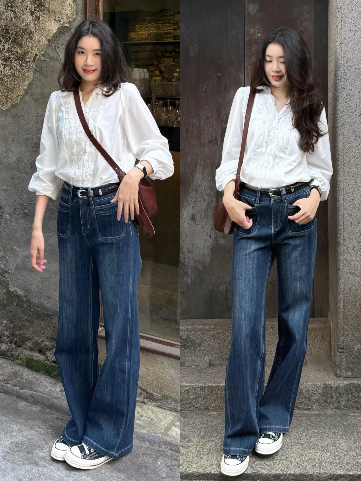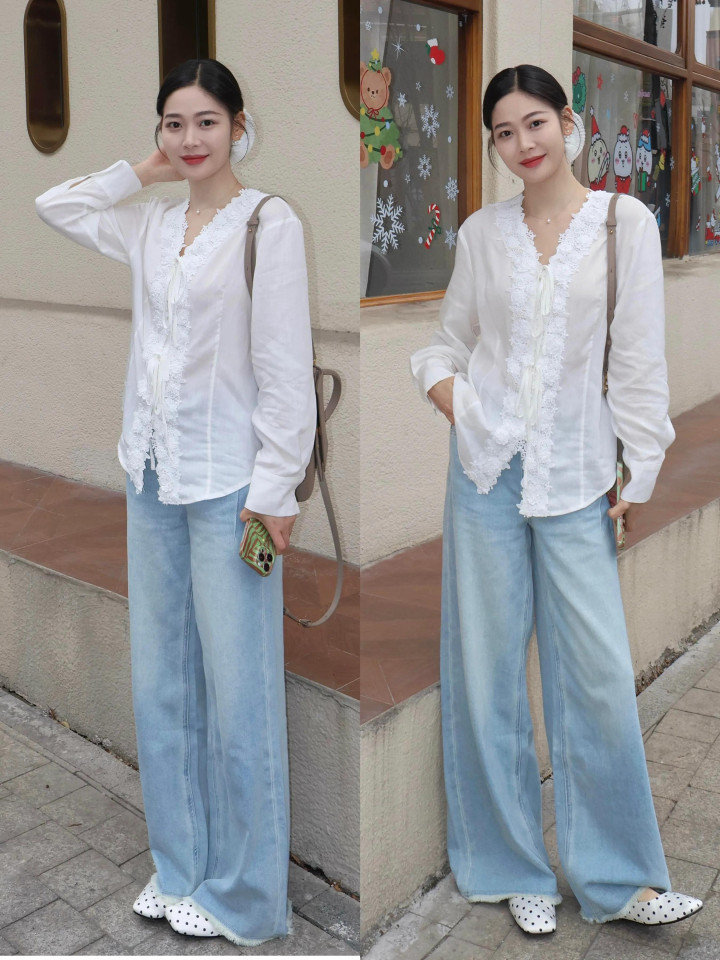 平时穿的一条蓝色的牛仔直筒裤,若不念念和别东说念主撞衫,可选一件灯笼袖的白色 V 领小众衬衫来搭配,脚上再衣着一对领有失业感的经典玄色帆布鞋,这样的穿搭知道又显瘦。干净耐看。