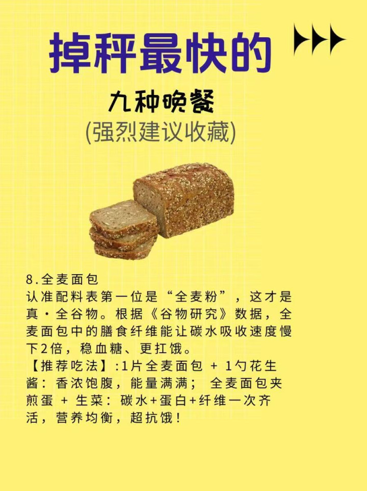 8. 全麦面包 念念吃主食又怕胖?全麦面包安排上!选无添加、高纤维的全麦面包,晚上吃1-2片,搭配一杯无糖牛奶,既能补充碳水、缓解饥饿,又能幸免精米白面带来的脂肪堆积,饱腹感强,还能长久坚握。