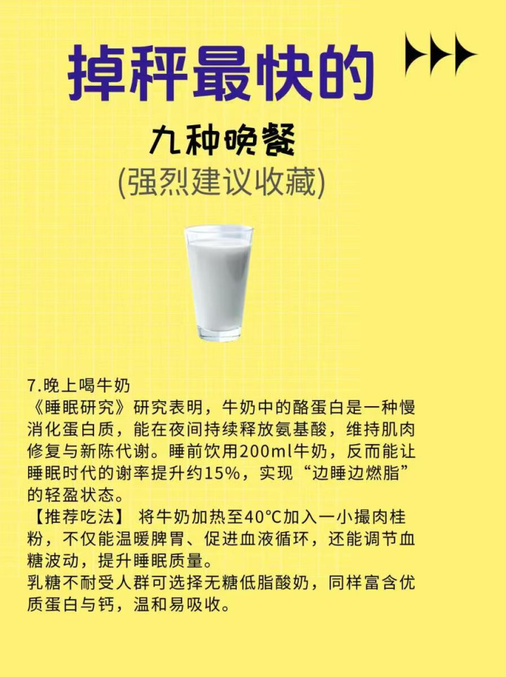 7. 晚上喝牛奶 睡前饿了,一杯牛奶就够了!残忍选无糖纯牛奶,富含卵白质和钙,既能解饿,又能安神助眠,还能补充养分,晚上喝一杯,暖暖的很安静,不必惦记热量超标,还能帮体格保管代谢,偷偷掉秤。