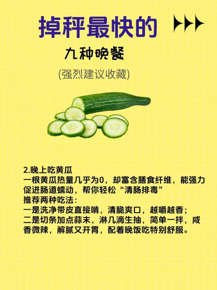 2. 晚上吃黄瓜 黄瓜十足是减肥晚餐的“王者”!零脂肪、低热量,水分足、膳食纤维丰富,晚上吃一根,脆嫩流露,既能快速填充胃部、缓解饥饿,又能促进肠说念蠕动,帮体格排垃圾,不必畛域量,吃撑也不惦记囤脂,懒东说念主必备。