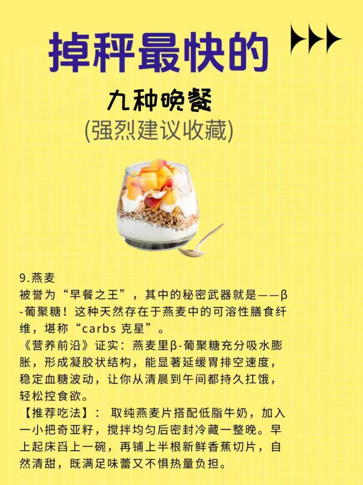 9. 燕麦 燕麦是减脂期的“矿藏主食”,富含膳食纤维和卵白质,晚上用温水或无糖牛奶冲泡一碗,黏稠软糯,饱腹感超强,能减慢饥饿,还能促进肠说念蠕动,加快代谢,不必加糖,清淡厚味,吃饱也能瘦。