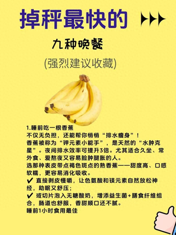 1. 睡前吃一根香蕉 睡前饿到睡不着?一根香蕉就能惩处!香蕉热量低、饱腹感强,富含钾元素,能缓解水肿,还含有色氨酸,匡助安神助眠,睡前半小时吃一根,既能解饿,又能幸免夜间暴食,滚球app还能帮体格代谢过剩水分,第二天起来体重偷偷下落。