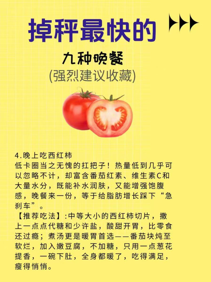 4. 晚上吃西红柿 西红柿酸甜流露,热量低、糖分少,富含番茄红素和维生素C,K8凯发官网晚上吃一个,既能解饿、解馋,又能促进脂肪代谢,还能补充维生素,不必复杂烹调,洗净径直吃,大略快捷,减脂期必备。