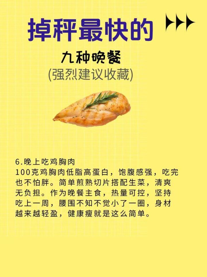 6. 晚上吃鸡胸肉 怕饿、念念吃肉的姐妹看过来!鸡胸肉高卵白、低脂肪,晚上吃80-100g,用蒸、煮、烤的容貌清淡烹调,不加过多调料,既能补充优质卵白,增强饱腹感,又能斥地肌肉、提升代谢,吃饱也不囤脂。