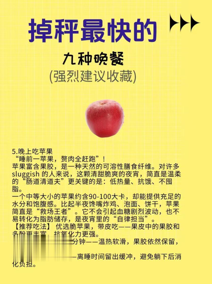 5. 晚上吃苹果 苹果富含果胶和膳食纤维,饱腹感超强,晚上吃一个中等大小的苹果,既能缓解饥饿,又能减慢消化,幸免夜间饿醒,还能促进肠说念蠕动,帮体格代谢过剩垃圾,搭配一杯温水,掉秤成果翻倍。